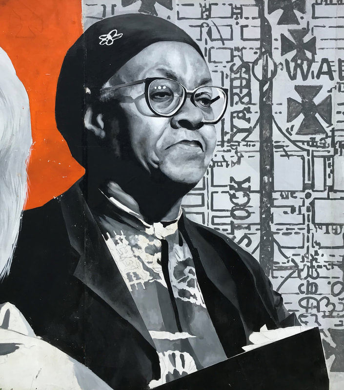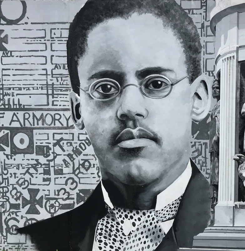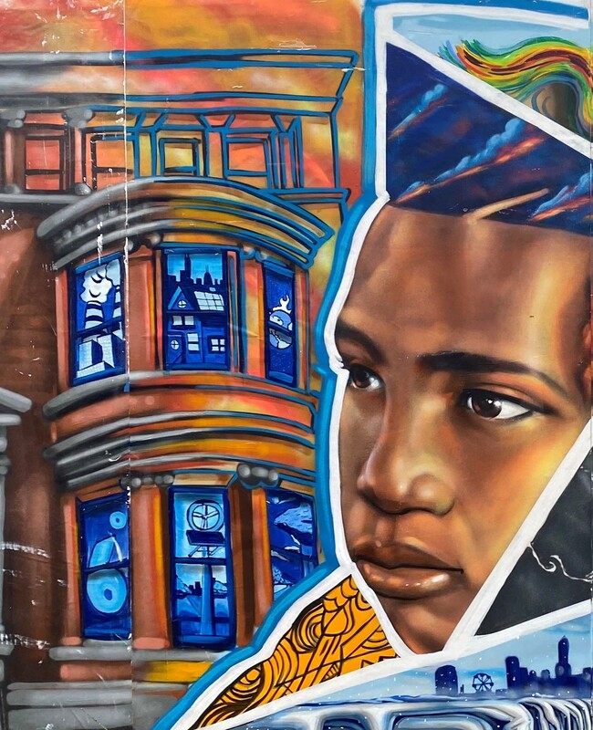Located in Bronzeville, a center of African-American life and culture in Chicago, this mural celebrates the community's rich history and modern-day renaissance. The mural also looks to the future which brings the threat of climate change, and it envisions rising above this challenge using innovation and renewable technologies to build a "Community of the Future".