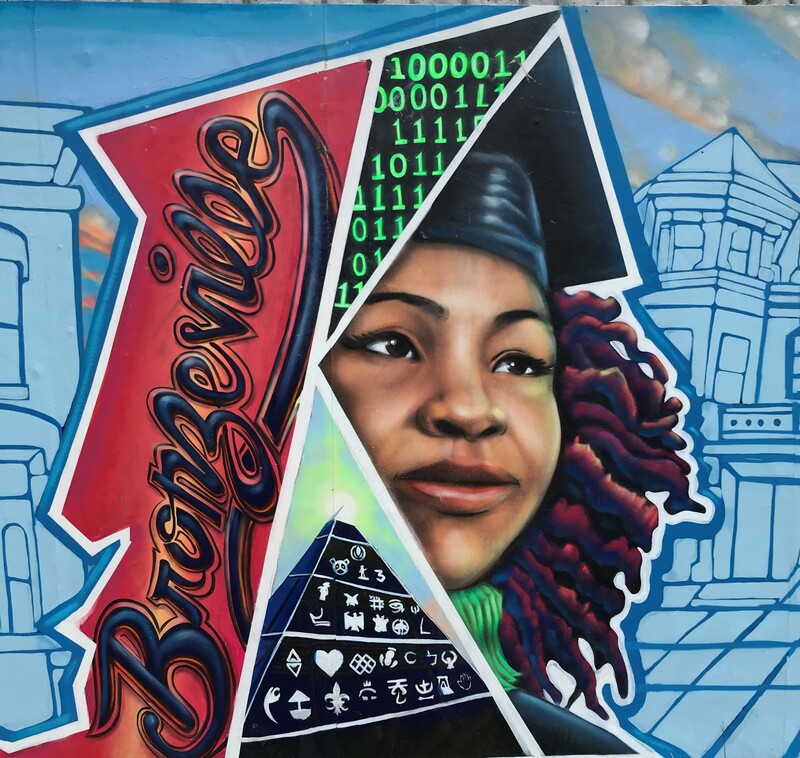 This mural was sponsored by ComEd, an electric utility serving Greater Chicago. Partnering with community leaders, ComEd is leading an initiative to develop a connected, resilient and sustainable community in Bronzeville called the "Community of the Future".